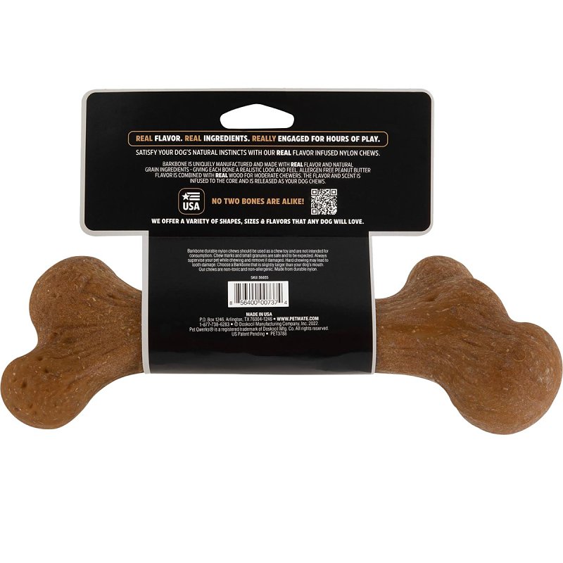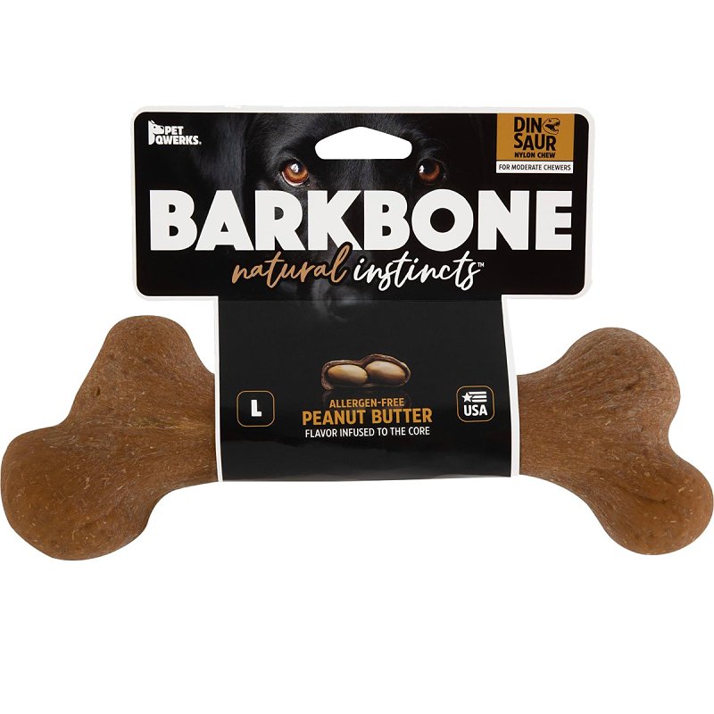 Captivate your dog's inner beast with BarkBone⢠natural instincts nylon chews. Allergen-free peanut butter flavor and scent are infused to the core of each bone and released as your dog chews. Made with REAL wood, these bones are designed for moderate chewers. The Dinosaur BarkBone has a realistic look and feel that is easy for dogs to pick up and hold and is designed with multiple chewing surfaces to keep your dog engaged in nonstop chew sessions. BarkBone is proudly made in the USA.Item Specifications