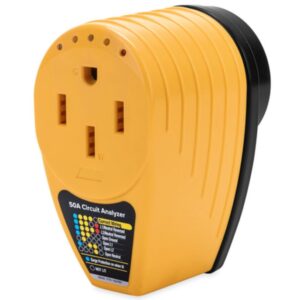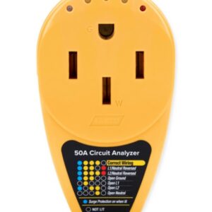 This item helps protect your RV from power surges and faulty electrical connections. Diagnostic LEDs indicate faults when you connect your electrical cord to the power pedestal. The circuit analyzer indicates faults for reverse polarity, open neutral and other wiring issues. Includes integrated surge protection of up to 2100 Joules. It is weather-proof and able to withstand adverse weather conditions. A contoured grip makes unplugging easier. 50 A male (NEMA 14-50P)/50 A female (NEMA 14-50R).Item Specifications