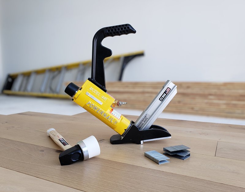 The Powernail Model 445FS mallet-actuated, pneumatic stapler uses the same proven design that has made our nailers the standard of the commercial flooring industry. You can be assured that the Model 445FS will stand up to the rigors of daily use for years and it will help you install a floor you can be proud of. When using staples to install 3/4 in and 5/8 in Tongue and Groove domestic hardwood flooring, the 445 FS tool delivers proven quality and professional results.Item Specifications