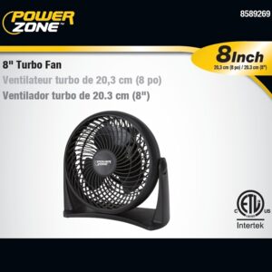PowerZone Turbo Fan, 120 VAC, 0.7 A, Frequency Rating: 60 Hz, Wattage Rating: 84 W, 3 Speeds, Number of Blades: 3, Blade Diameter: 8 in, Control Type: Rotary, 3, Rotating Angle: 90 deg, Cord Length: 72 in, Plastic Blade, Housing Material: Plastic, Powder-Coated, Black, Table Mounting, Dimensions: 10-3/4 x 10-1/4 x 5-1/4 in, Plastic