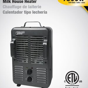 PowerZone Deluxe Portable Milk House Heater offers (2) 120 V, 12.5 A heat stages, 60 Hz, 1300/1500 W, 72 in cord length, durable metal housing material, adjustable thermostat, tip-over switch, and overheat protection. Suitable for garages and workshops. Size: 10 in W, 15 in H, 7 in D.Item Specifications