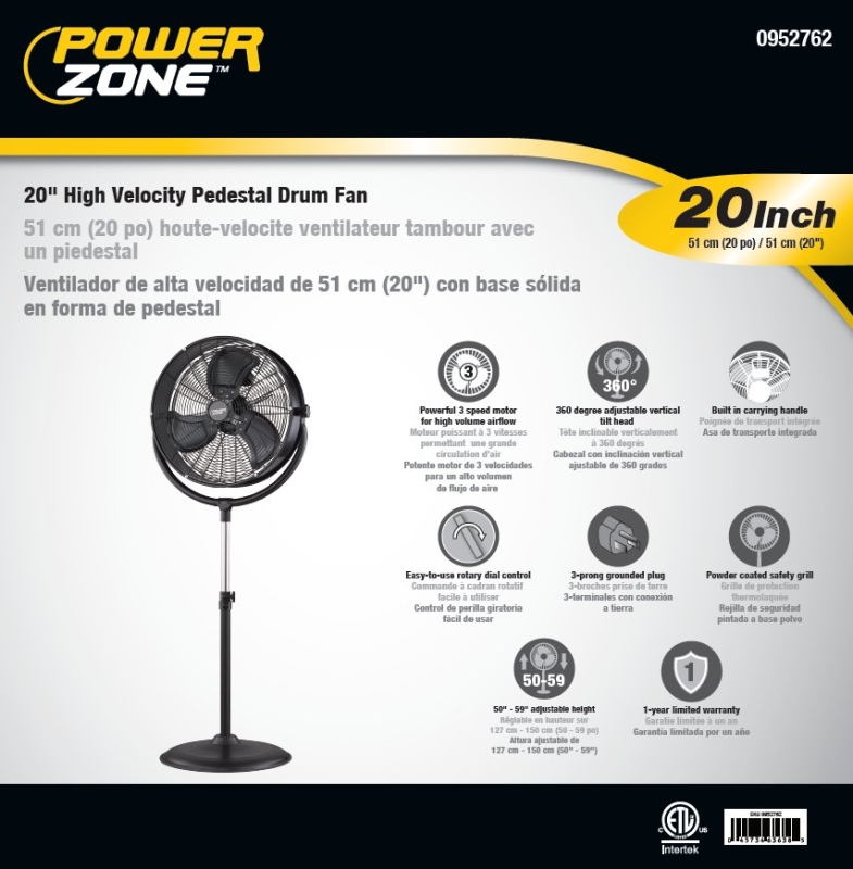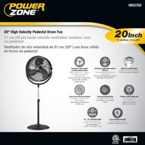 High-Velocity Pedestal Drum Fan, rotary dial controls, 3 speed settings, and all metal construction. CFM: 3370/4490/5100. Adjustable 240 deg vertically tilting fan head. Size: 25-1/4 in L x 6-3/4 in W x 50-59 in H. ETL/cETL listed.Item Specifications