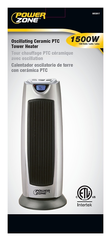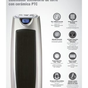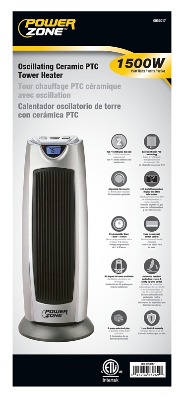 Features adjustable thermostat, 750/1500W heat settings plus fan only. Energy efficient PTC technology. LCD digital temperature display and other information. Programmable timer 1 hour - 8 hrs. Easy-to-use push button control. ETL and cETLus.Item Specifications