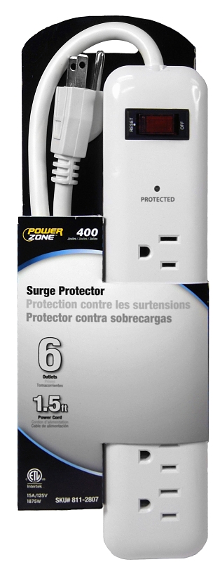 PowerZone 6-outlet multimedia surge protector has 400 Joules of surge protection and powers everything on your desk or home entertainment system. This outlet has a 1.5ft power cord.