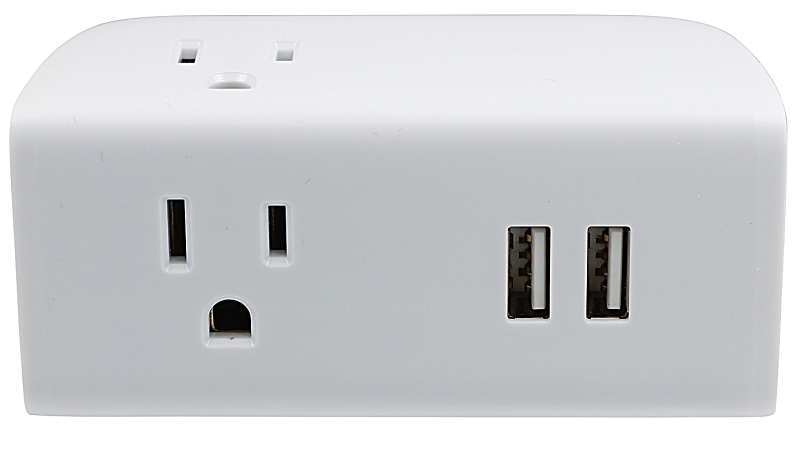 You can diversify your power source with this 3-outlet wall tap. It features three grounded AC outlets and 2 USB ports, the plug-in tap transforms your regular outlet into a safe, multi purpose charging station. The space-saving wall tap provides easy access to plugging in multiple items at one time which is ideal for any room in your home, regardless of size or setup. This outlet features an integrated circuit breaker for overload protection. You can be rest assured that your electronics are protected from damaging voltage spikes. Because of it's white color, this wall tap ensures your powering station does not distract from your roomâs interior design. For even more convenience, the tap can be simply plugged into a duplex outlet for temporary use. Use the wall tap as part of your permanent home or office setup or, for holidays and special occasions, create a centralized location for powering a roomâs worth of electronic lights and decorations. Organize your electronics with the PowerZone 3-outlet wall tap.Item Specifications