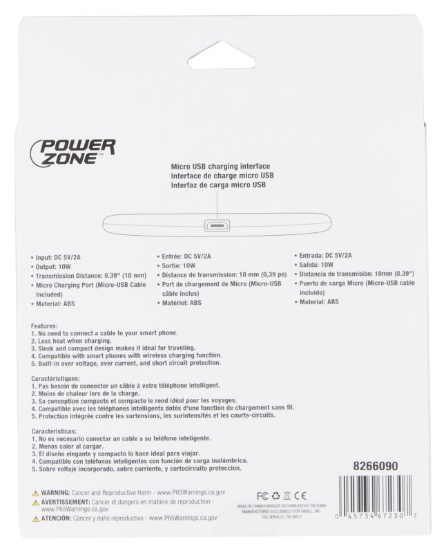 Micro USB wireless charger. DC5V/2A input, 10W output. 0.39 in (10mm) transmission distance. Made of ABS material. Black color.