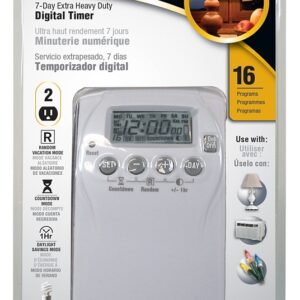 The PowerZone Indoor Timer has a random in-lived-in mode that turns the unit on/off multiple times throughout. The unit accepts most right angle and transformer plugs when the reverse ground pin placement is mounted to the wall. With it's 7-day programmable function, it can be set to turn off any time, any day. It has 16 customizable on/off settings and multiple settings based on day, hour, and minute. The angled housing design and large LED screen make the unit easy to read and program. It can automatically adjusts to daylight savings time. The countdown function provides for a time period of up to 19 hrs and 59 mins. This timer has two 3 prong grounded outlets that can be used with indoor devices requiring a grounded connection, which can control 2 devices from one outlet. Because of it's quick charge, the initial 30 mins charge provides power to the programmed unit while unplugged. The battery backup maintains presets during power outages. It's compatible with CFL, LED, fluorescent and incandescent bulbs. This time is ideal for extra heavy-duty use with home electronics and appliances requiring high wattage/AMP consumption. 15 A tungsten, 1 hp.