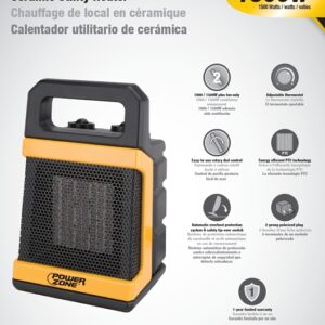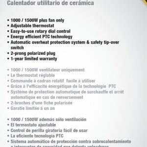 Ceramic utility heater has 1000/1500W heat settings, adjustable thermostat, safety over heating protection and safety tip-over switch. Energy efficient PTC technology. Plastic construction. ETL/CETL listed. Size: 11-1/2 in H x 7 in W x 6 in D.Item Specifications