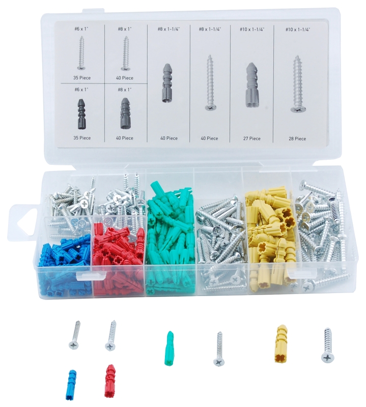 | Includes | Philips Screws 35 PC 6 x 1 in 40 PC 8 x 1 in 40 PC 8 x 1-1/4 in 28 PC 10 x 1-1/4 in. Wall Anchors 40 PC 8 x 1/4 in 27 PC 10 x 1-1/4 in 35 PC 6 x 1 in 40 PC 8 x 1 in |