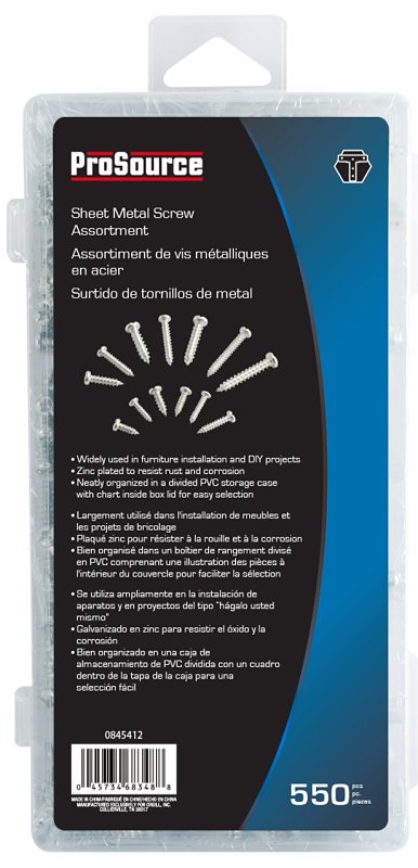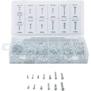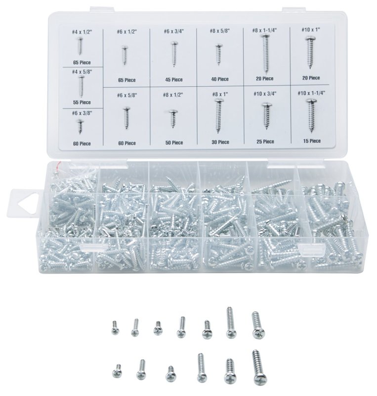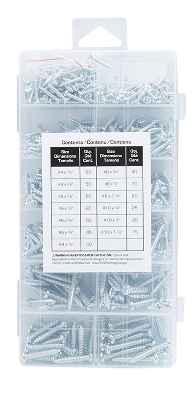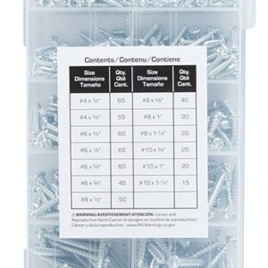 | Includes | (65) 4 x 1/2 in (55) 4 x 5/8 in (60) 6 x 3/8 in (65) 6 x 1/2 in (60) 6 x 5/8 in (45) 6 x 3/4 in (50) 8 x 1/2 in (40) 8 x 5/8 in (30) 8 x 1 in (20) 8 x 1-1/4 in (25) 10 x 3/4 in (20) 10 x 1 in (15) 10 x 1-1/4 in |
