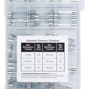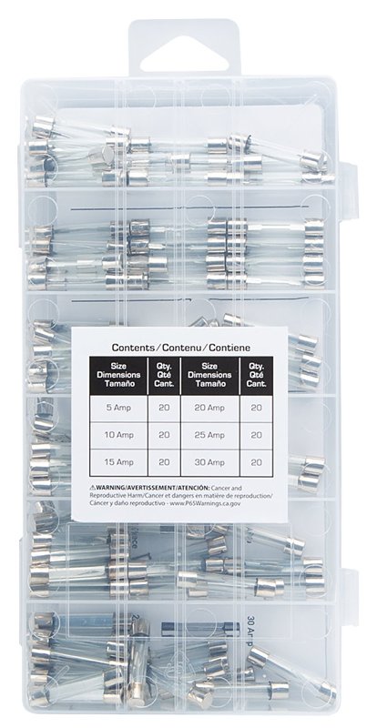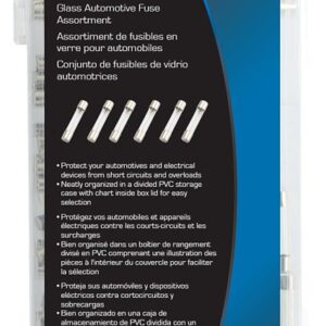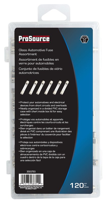 ProSource AGC Automotive Glass Fuse Assortment keeps automotive and electrical devices safe from short circuits and overloads. The assortment includes 120 pieces neatly organized in a divided PVC storage case.