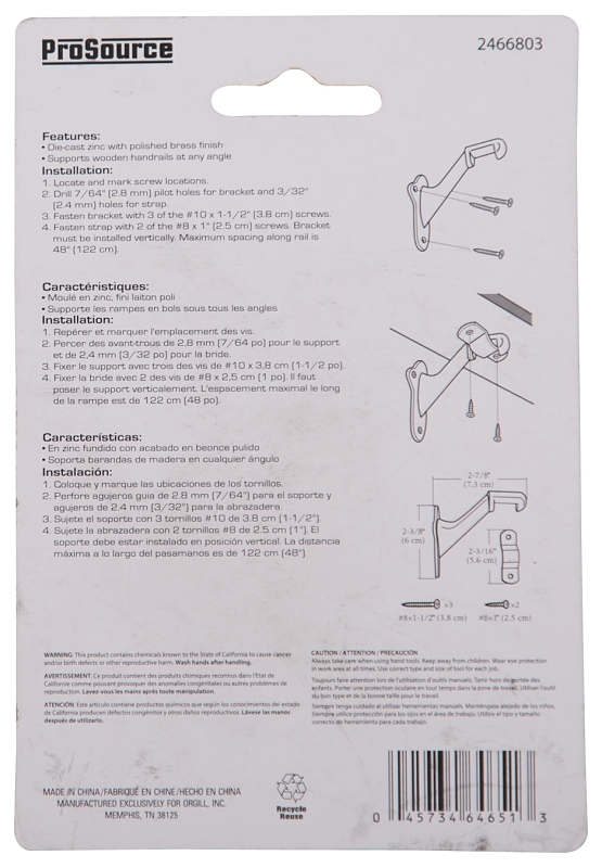 This Handrail bracket is ideal for supporting handrails at any angle. Use in hallways or stairwells. Great for indoor or outdoor use. Easy to install. Zinc alloy handle with steel plate brace and screws. 3 in projection. 2-3/8 in base height. 11/16 x 2-1/8 in clip. Accommodates 3/4 in handrail.Item Specifications
