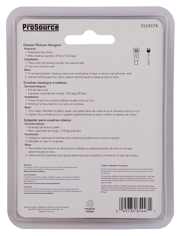 Home > Hardware > General Hardware > Hanging Hardware > Picture Hangers > ProSource PH-122270-PS Picture Hanger, 30 lb, Steel, Polished Brass, Brass, Nail-In Mounting