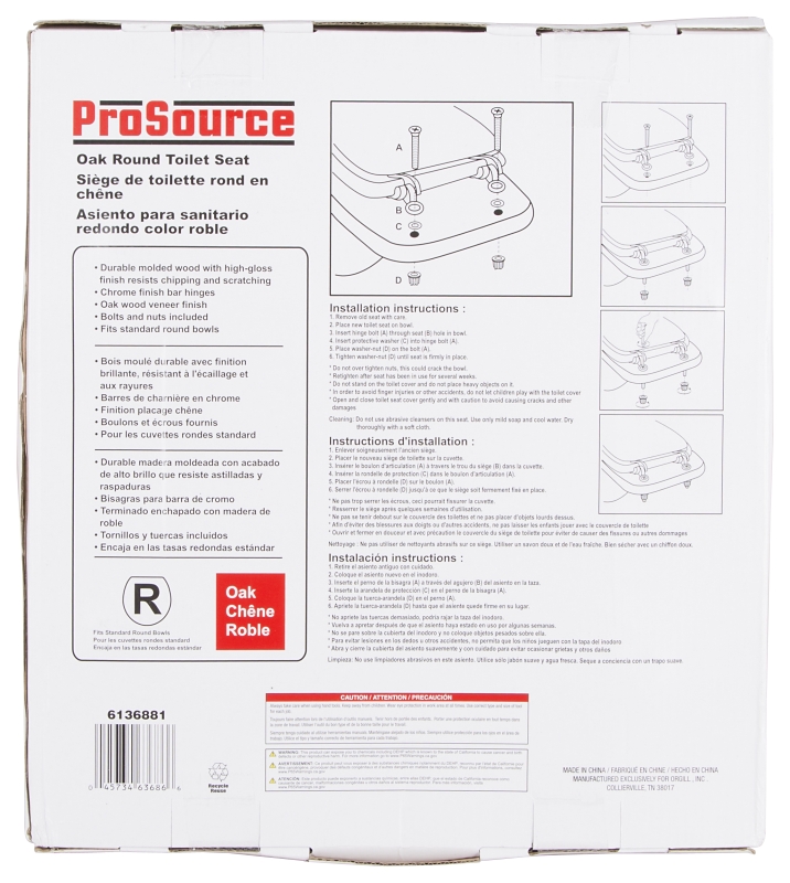 The ProSource toilet seat is made of MDF molded fiberboard wood composition with a high-gloss oak finish that resists chipping and scratching. Includes chrome hinge, bolts, and nuts.