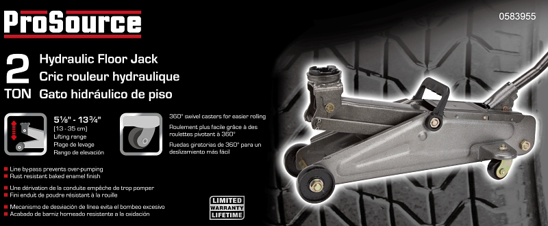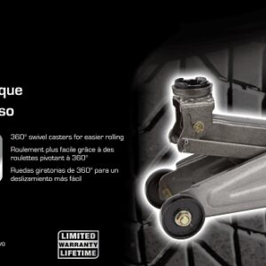 Swivel casters, 360 degree for easy rolling. Line bypass prevents over pumping. Rust-resistant, baked enamel finish for durability. 2 ton offers 4000 lb capacity or 5-1/8 to 13-3/4 in lifting range.