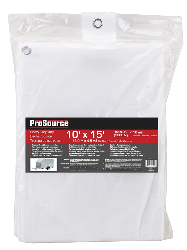 ProSource Tarp, Plastic, White, 15 ft L, 10 ft W, 10 mil Thick, Grommet Spacing: 18 in, Grommet Material: Aluminum, Resists: Sunlight, Tear, UV Rays, Water, Suitable for: Camping, hunting, tent fly, storage cover, canopy, boat cover, woodpile coverItem Specifications