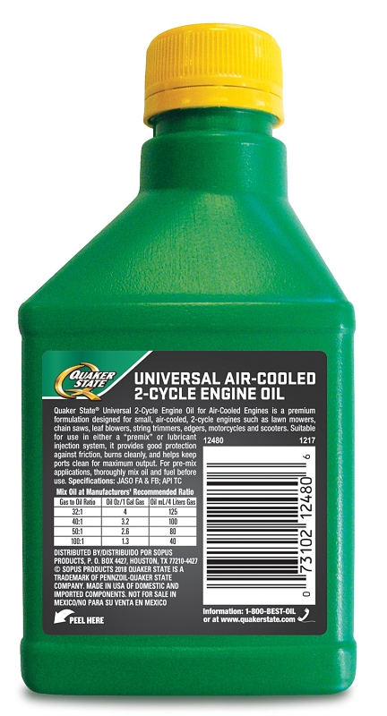 Quaker State® universal 2-cycle engine oil for air cooled engines is a premium formulation blended from high viscosity index, paraffin base stocks. This oil is fortified with low ash-forming detergency additives, extreme pressure anti-wear components, a pour depressant and a coupling agent to enhance oil-gasoline mixtures. Designed for use in hot running, air-cooled engines such as chainsaws, lawnmowers, leaf blowers, string trimmers and 2-cycle edgers, snowmobiles and some two-stroke motorcycles, it can be mixed at any ratio up to 1 gal of gasoline at popular 40:1 mix ratio. Quaker State® universal 2-cycle engine oil for air cooled engines can be used with oxygenated/gasohol fuels and current 87 octane rated gasolines. High flash solvents meet NFPA Class IIIB standards for easy warehouse storage. Meets current JASO standards FA and FB and exceeds API service level TC.Item Specifications