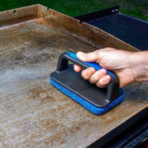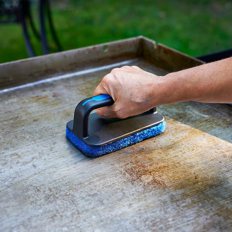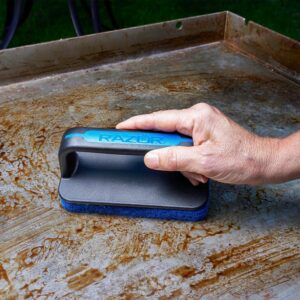 Remove grime, grease and burnt food off your griddle to restore its original shine using the Razor® griddle scrubber. Ideal for stubborn, hard to clean grease and food residue. The durable handle provides balanced pressure for even the toughest food debris. Including an easy-to-replace scrub pad attached by a durable hook and look closure. Scrub away to a new-looking griddle every time.
