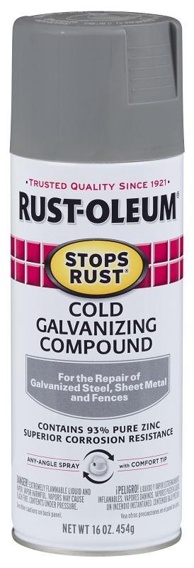 Rust-Oleum STOPS RUST® cold galvanizing spray provides maximum corrosion resistance through galvanic protection. Use for touch-up and repair to damaged galvanized steel, galvanized ducts, fences, gutters, trucks, trailers and more. Do not topcoat with an alkyd finish.