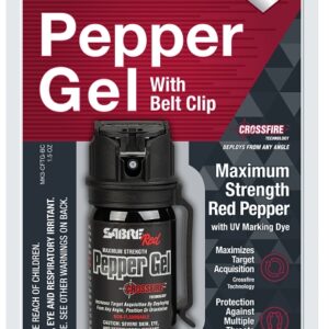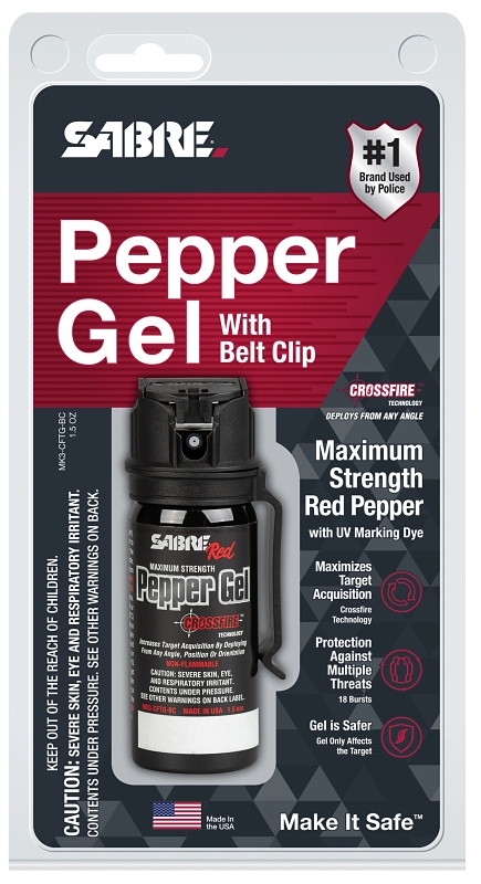 Boasting the same police strength protection as law enforcement, SABRE is the most popular formulation carried by police worldwide and contains UV marking dye to help police in suspect identification. This SABRE crossfire pepper gel with belt clip offers you protection from an impressive distance of 18 ft (5.5 m) range and provides protection against multiple threats with 18 bursts. SABRE's crossfire technology allows the pepper gel to be sprayed at any angle, even upside down, maximizing target acquisition and making it more dependable against moving threats. The flip top safety mechanism prevents accidental discharge and the attached belt clip allows you to carry your pepper gel with you when commuting to work or home. Pepper gel virtually eliminates wind blowback with no in-air atomization and can even be used safely indoors. SABRE pepper gel is made in USA.