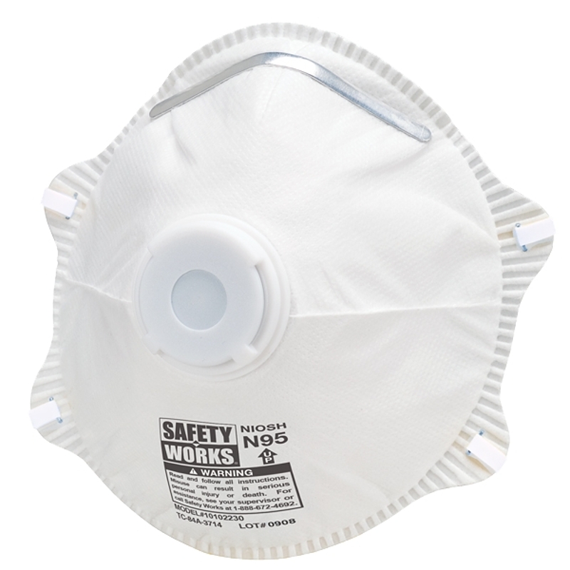 Safety Works Disposable Respirator with Exhalation Valve, Mask Size: One Size, Polyester, Filter Class: N95, White
