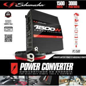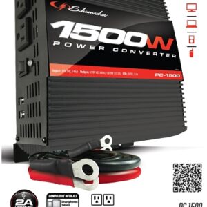 Converts 12 VDC to 115 VAC. Has two NEMA 5-15 USA AC outlets and 5 V, 2 A USB ports. Built-in, high-speed cooling fans help keep the unit cool. On/Off switch and LED Indicator. Heavy-duty battery cables connect directly to vehicle battery. Thermal protection, surge protection and low battery alarm. Contains a power converter, set battery cables, ground wire, owner's manual.Item Specifications