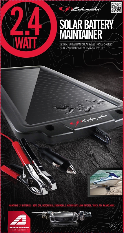 Trickle charges 12 V battery. 2.4 W maximum. Works under cloudy conditions. Environmentally safe and no power needed. 4 mounting screw included. 0.50 H x 7.37 W x 14.62 D. Weight 1.7 lb. Energy Star rated.