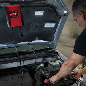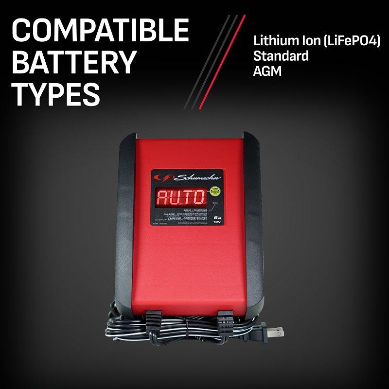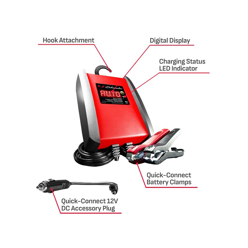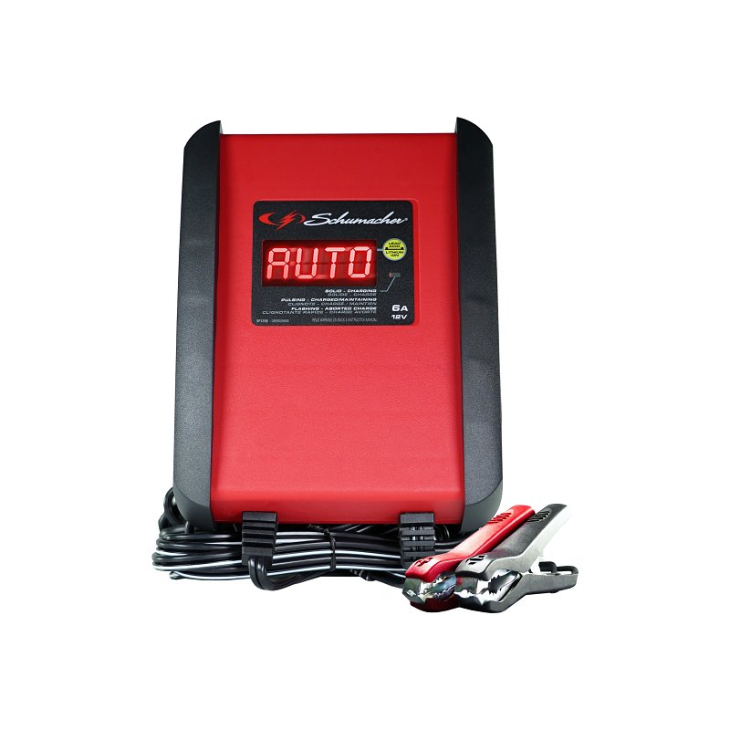 Schumacher Automatic Battery Charger, 120 VAC Input, 12 V Output, 1.5 A Input, 6 A Charging Current, 12/6 V Battery, Clamp Terminal, 7 ft Cord Length, Plastic, Red, Dimensions: 8.13 in L x 3.88 in W x 9.38 in H, Suitable for: AGM, Lead Acid, Lithium-Ion and Standard Batteries, Includes: (1) Clamp Adapter, (1) 24 in Fused Ring Leads Harness with Weather Cap, (1) DC AdapterItem Specifications