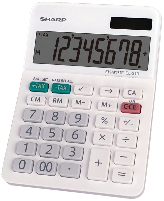 8-Digit professional mini-desktop calculator is ideal for business professionals at home or in the office. The EL-310WB is finished in a modern white design and features a large angled LCD display and durable plastic keys. Other functions include automatic tax keys, percent key, square root key, backspace key and four key independent memory including memory plus, memory minus, recall memory and clear memory. Extra-large plus key and automatic power down. Operates on twin power (solar/battery backup).
