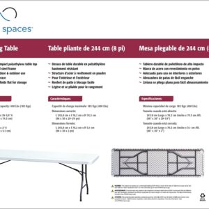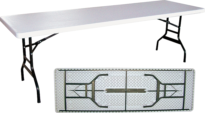 With this multi-utility banquet table you can be rest assured that you will have enough surface space for any function and take the stress out of hosting your next gathering. This rectangular bi-fold folding table is 8 feet long and is beneficial in a multitude of settings that include banquet halls, conference centers, cafeterias, schools and in the home. Use as a temporary seating solution or setup for everyday use. This plastic folding table comfortably seats up to eight adults while ensuring plenty of legroom. Speed up the time it takes to set-up and tear-down wedding receptions, graduation parties, banquets, buffets and other events with this folding table. Whether you're hosting an indoor or outdoor gathering, the smooth design is easy to wipe clean. When using for outdoor events store indoors to protect the frame from extreme moisture. The table legs fold under for storage while the attached carrying handle provides better portability. This table is commercial grade to withstand everyday use in the hospitality industry.Item Specifications