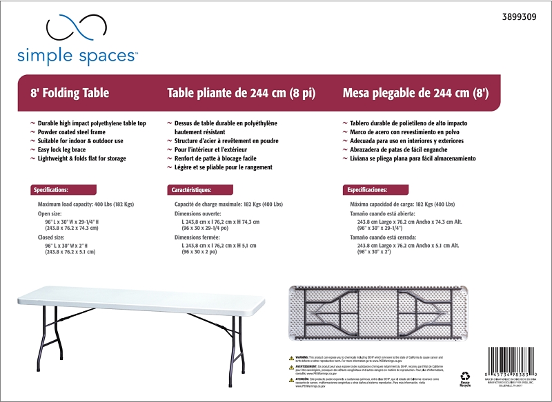 | Folding Size | 96 in L x 30 in W x 2 in H |
