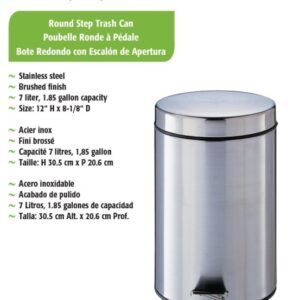 The Simple Spaces trash can has a 1.85 gal capacity. Its made of stainless steel. The diameter is 8-1/8 in.