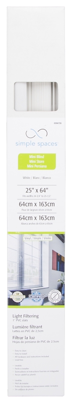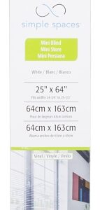 Simple Spaces Blind, Cordless, Mini, Vinyl, White, 64 in Length, 25 in Width, 0.33 mm Thickness, Inside Mounting, Suitable for: 24-3/4 to 25-1/2 W Window in, Includes: Mounting Hardware and InstructionsItem Specifications