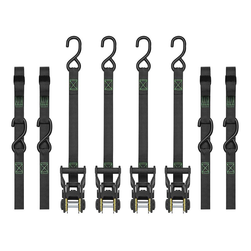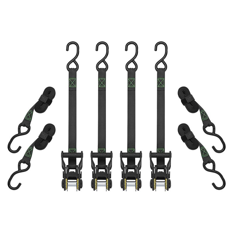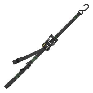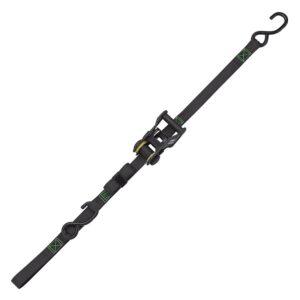 The tactical ratchet tie-down is stronger and more user friendly than standard ratcheting tie-downs. They can be used for lighter loads often hauled in a pick-up truck or on a small trailer such as dirt bikes, ATV's or lawn tractors. Provides extra-long webbing on attachment end for hard to reach anchor points. Features a diamond knurl handle for increased grip and rubber bumpers along the ratchet to protect your cargo from scratching . Use the built-in soft-tie loop to secure cargo without damaging paint or chrome.Item Specifications