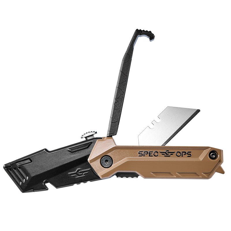 Built with an armor-grade aluminum body, this SPEC OPS folding retractable utility knife is dutifully compact yet tested and proven unbreakable on the harshest job sites. At just 3.5 in when folded, this knife seamlessly fits in your pocket and comes with a belt clip for optimum portability and storage. Its unique pistol style finger grip and camo textured body allow for elite comfort and ultimate control when cutting. The pushbutton blade swap allows for tool-free and rapid reloading of utility blades. Integrated into the knife's design is a quick-release button on the rear of the knife that reveals a blade magazine with three standard utility blades included. Two added features make this knife stand apart from others on the market the glass breaker that can be used in an emergency and the integrated strap cutter for cutting plastic packaging straps around lumber and fasteners. And with a assurance to deliver a lifetime of mission capability on the world's toughest job sites, this knife has been drop-tested at 100 feet to surpass MIL-SPEC standards. All SPEC OPS tools are backed by our five-star, hassle-free lifetime warranty and with each purchase made, we support our nation's heroes by donating 3% of proceeds to veteran and first responder causes.Item Specifications