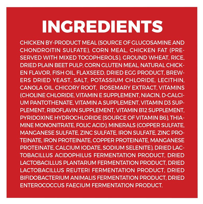 IngredientsINGREDIENT STATEMENT CHICKEN BY-PRODUCT MEAL (SOURCE OF GLUCOSAMINE AND CHONDROITIN SULFATE) CORN MEAL CHICKEN FAT (PRESERVED WITH MIXED TOCOPHEROLS) GROUND WHEAT RICE DRIED PLAIN BEET PULP CORN GLUTEN MEAL CHICKEN NATURAL CHICKEN FLAVOR FISH OIL FLAXSEED DRIED EGG PRODUCT BREWERS DRIED YEAST SALT POTASSIUM CHLORIDE LECITHIN CANOLA OIL CHICORY ROOT ROSEMARY EXTRACT VITAMINS (CHOLINE CHLORIDE VITAMIN E SUPPLEMENT NIACIN D-CALCIUM PANTOTHENATE VITAMIN A SUPPLEMENT VITAMIN D3 SUPPLEMENT RIBOFLAVIN SUPPLEMENT VITAMIN B12 SUPPLEMENT PYRIDOXINE HYDROCHLORIDE (SOURCE OF VITAMIN B6) THIAMINE MONONITRATE FOLIC ACID) MINERALS (COPPER SULFATE MANGANESE SULFATE ZINC SULFATE IRON SULFATE ZINC PROTEINATE IRON PROTEINATE COPPER PROTEINATE MANGANESE PROTEINATE CALCIUM IODATE SODIUM SELENITE) DRIED LACTOBACILLUS ACIDOPHILUS FERMENTATION PRODUCT DRIED LACTOBACILLUS PLANTARUM FERMENTATION PRODUCT DRIED LACTOBACILLUS REUTERI FERMENTATION PRODUCT DRIED BIFIDOBACTERIUM ANIMALIS FERMENTATION PRODUCT DRIED ENTEROCOCCUS FAECIUM FERMENTATION PRODUCT.