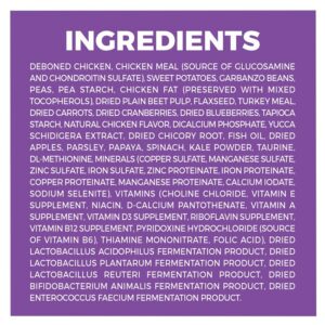 | Ingredients | Deboned Chicken Chicken Meal (Source of Glucosamine and Chondroitin Sulfate) Sweet Potatoes Garbanzo Beans Peas Pea Starch Chicken Fat (Preserved with Mixed Tocopherols) Dried Plain Beet Pulp Flaxseed Turkey Meal Dried Carrots Dried Cranberries Dried Blueberries Tapioca Starch Natural Chicken Flavor Dicalcium Phosphate Yucca Schidigera Extract Dried Chicory Root Fish Oil Dried Apples Parsley Papaya Spinach Kale Powder Taurine Dl-Methionine |