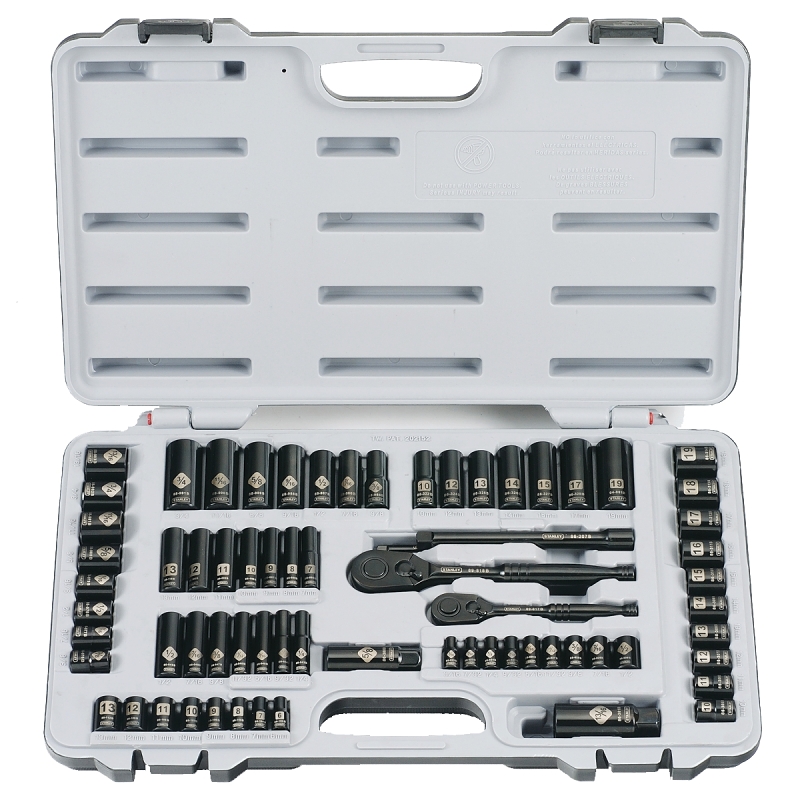STANLEY Socket Set, Black, Chrome, Number of Pieces: 69, Includes: (33) 3/8 in Drive Sockets, (30) 1/4 in Drive Sockets, (1) 3/8 in Drive Pear Head Ratchet, (1) 1/4 in Drive Pear Head Ratchet, (1) 3/8 in Drive Spark Plug Socket, (1) 3/8 in Drive Spark Plug Socket, (1) 1/4 in Drive Extension Bar, (1) 3/8 in Drive Extension Bar, Blow Molded Carry CaseItem Specifications