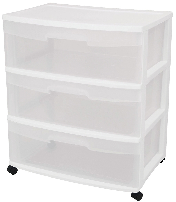 The wide 3-drawer cart features three wide, clear drawers that allow for easy identification of contents. This cart is ideal for organizing clothing and linens in the bedroom and bathroom. Casters are included to create a rolling storage option.Item Specifications