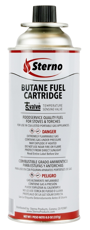 Sterno Butane Fuel Cartridge with TSV, Net Content: 8 oz, Can, Burn Time: 4 hr, Odor/Scent: Rotten Egg, Compositions: Butane, Isobutane, Propane, Boiling Point: -11 deg C, Density: 0.55 g/cc, Vapor Pressure: 3000 hPaItem Specifications