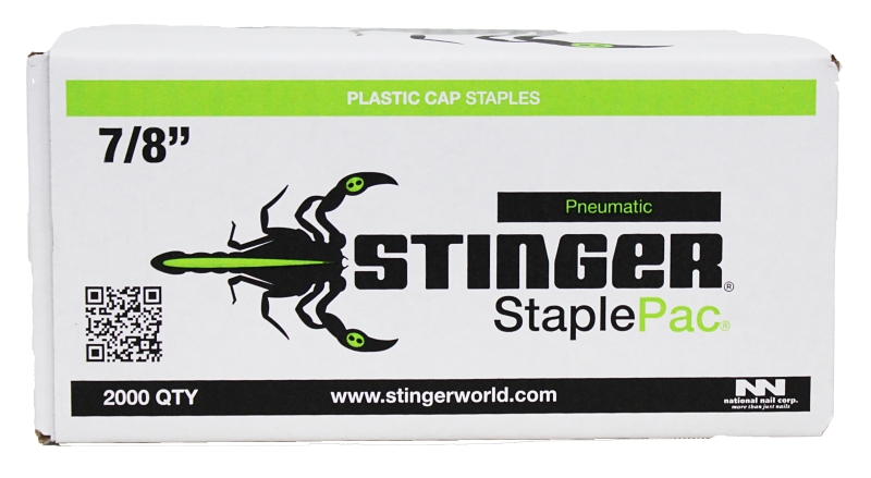 Plastic cap staples for use with Stinger cap staple tools to secure roofing felt and house wrap. Contains 2000 plastic caps and 2000 staples in each staple pack.