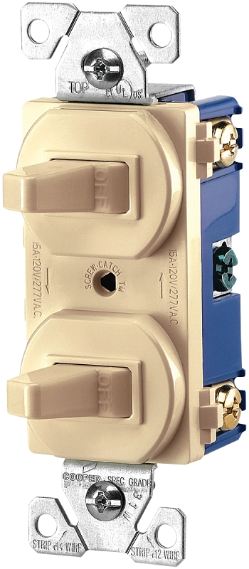 Grounding terminal screw standard. Combination switch with additional switch has 120/277 volt rating, ideal for fluorescent lighting fixtures typical in commercial applications. 0.050" thick steel mounting strap zinc-plated for corrosion resistance. Break-off provision for wiring both devices on same circuit or on separate circuits. Terminal screws backed out and ready for wiring. Side wire terminals accept up to #10 solid or stranded wire. Combination slot/Phillips head mounting and terminal screws. Switches meet all UL 20 requirements. UL Listed.Item Specifications