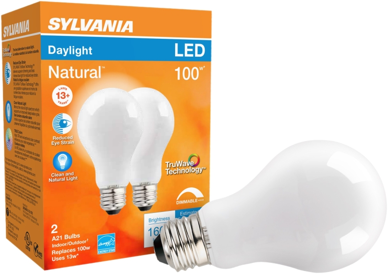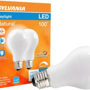 Sylvania Natural LED Bulb, General Purpose, Wattage Rating: 13 W, 120 V, Lamp Base: E26, Lamp Shape: A21, Lamp Finish: Frosted, Lumens: 1600 Lumens, Dimmable: Dimmable, Light Color: Daylight, Average Life: 15,000 hr, Incandescent Equivalent: 100 WItem Specifications