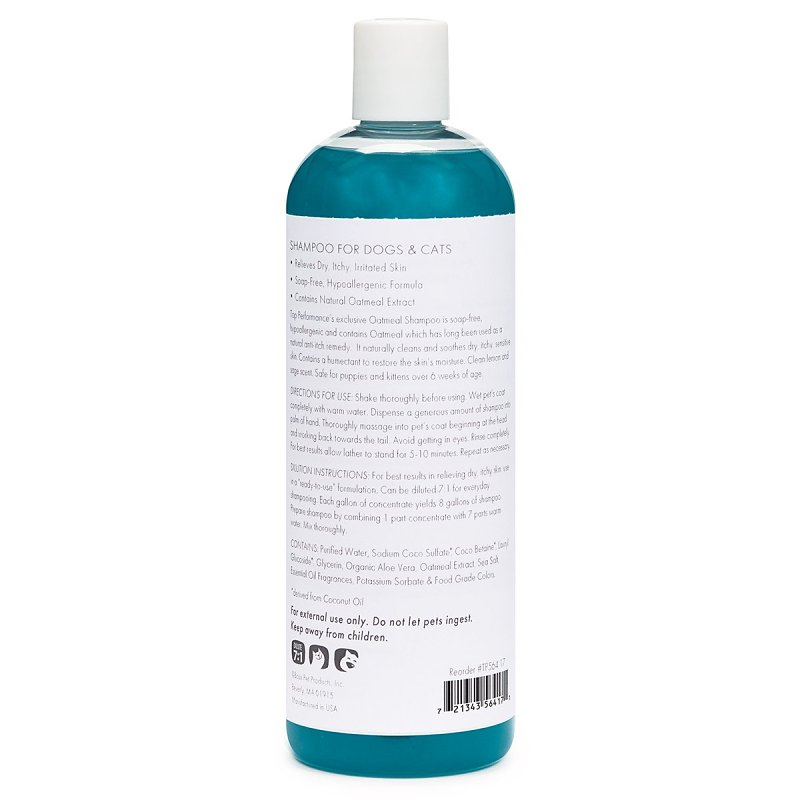Top Performance® oatmeal shampoo for dogs and cats helps relieve dry, irritated skin with a soothing combination of natural oatmeal, coconut oil and aloe vera. Top Performance® oatmeal conditioner moisturizes dry, itchy, flaky skin. This oatmeal shampoo and conditioner can be used full strength for extra itch relief or diluted 7:1 for everyday use.Item Specifications