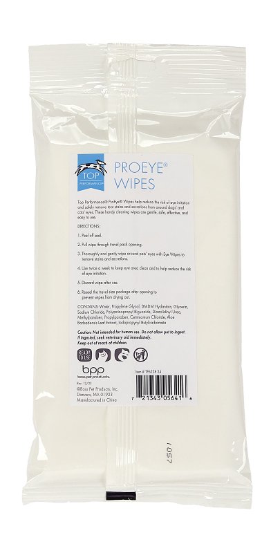 Formulated to be safe, effective and easy to use, 7 x 8 in Top Performace® eye wipes are pre-moistened with pet eye-area cleaner. Use to remove tear stains and secretions. Reduces risk of eye irritation. 24 pack is ideal for home, travel or salon.