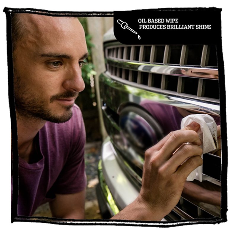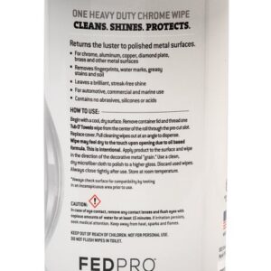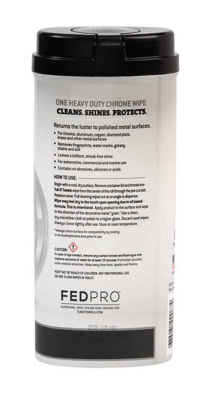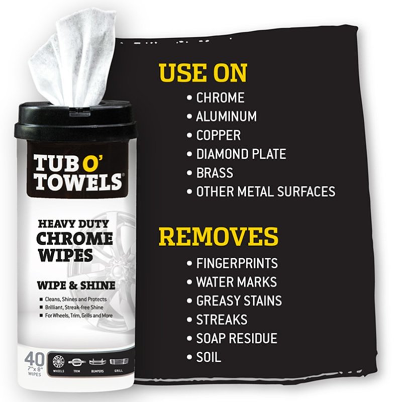 Tub O' Towels heavy-duty chrome cleaning wipes remove finger prints, water marks and greasy stains. Specifically designed for polished metal surface cleaning, these wipes are non-abrasive and leave a brilliant, streak-free shine. Did you know when cleaning polished metal surfaces allow you should always allow the metal surface to cool first and test any metal surface product in an inconspicuous spot. Our chrome and aluminum stain removing wipes work well with the following stains: finger prints, water marks, greasy stains, road grime, soils and other water-based stains. And of course, keep in mind the sooner you treat the stains the better the result will be, though many of our customers have reported they were able to get much older surface stains off of their polished metal surfaces with our product.
