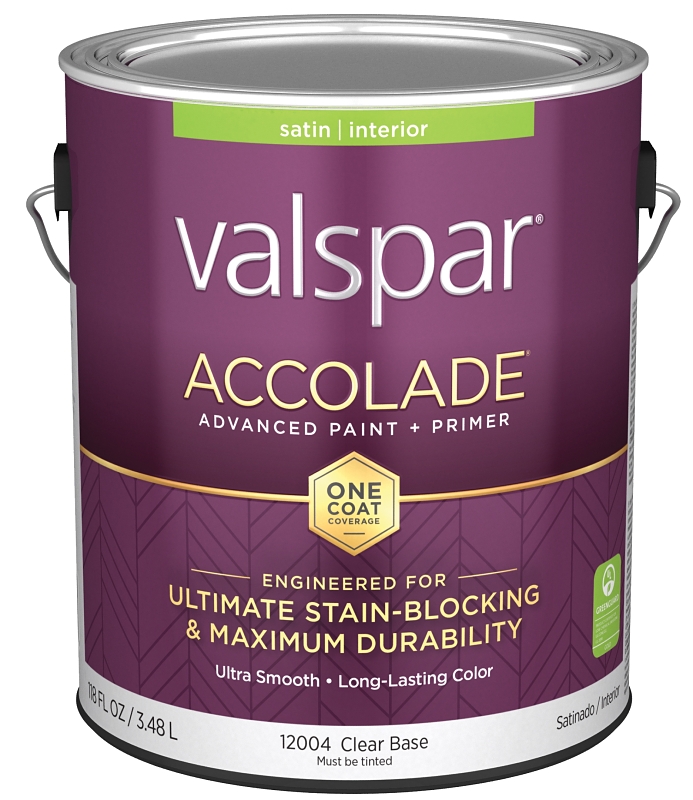 Home > Paint and Sundries > Paint and Stains > Valspar Paint > Interior Latex Satin > Valspar Accolade 1200 028.0012004.007 Latex Paint, Acrylic Base, Satin, Clear Base, 1 gal, Plastic Can