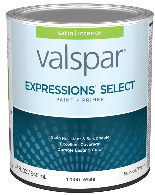 Home > Paint and Sundries > Paint and Stains > Valspar Paint > Interior Latex Satin > Valspar Expressions Select 4200 028.0042000.005 Latex Paint, Acrylic Base, Satin Sheen, White Base, 1 qt