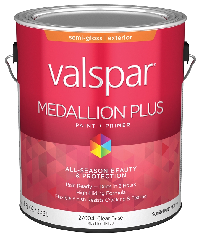 Home > Paint and Sundries > Paint and Stains > Valspar Paint > Exterior Latex Semi Gloss > Valspar Medallion Plus 2600 028.0027004.007 Latex Paint, Acrylic Base, Semi-Gloss Sheen, Clear Base, 1 gal