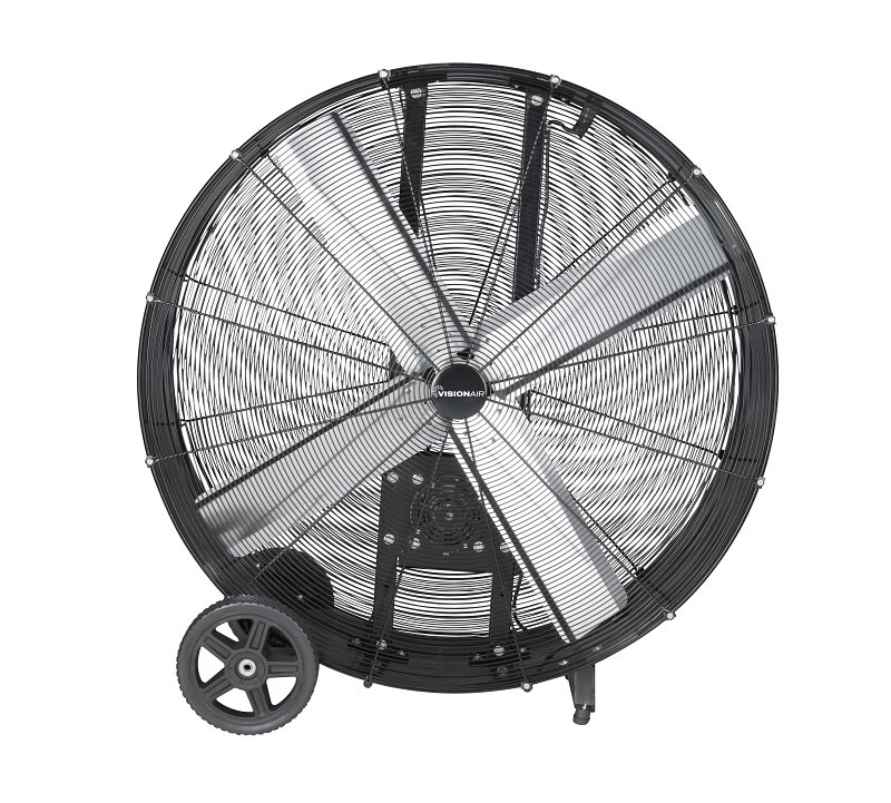 When industrial cooling demands uncompromising performance, the visionair 42 in heavy-duty belt drive drum fan delivers. Boasting substantial 42 in industrial-grade aluminum fan blades, it's powered by a robust 2/3 hp belt drive motor, generating an impressive 15370 cfm of airflow. With two-speed settings and all metal construction with a durable powder-coated finish, it's engineered for rugged use. The heavy-duty permanently lubricated motor ensures long-lasting reliability. Equipped with 8 in wheels for effortless portability and an 8 ft grounded power cord, it's your go to solution for demanding cooling needs.Item Specifications